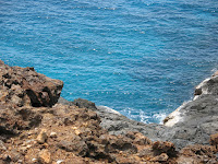 We headed south towards Colorado Point but Highway 1B suddenly was barricaded near the airport so we headed north to Santa Cruz, then caught another highway which was mismarked on our map, but it got us back towards the coastline, passing through the sleep town of Savaneta and San Nicholas. We did pass the water treatment plant which is said to create some of the best desalinized water in the world. I would agree. The only thing strange about the water is that it’s never cold. Even in the hotel, it comes out of the tap lukewarm. In the shower, the water barely heats up so maybe it’s a good thing that it’s naturally warm. Apparently the pipes are buried at a very shallow level all over the country. We also passed the Valero Oil Refinery. Oil was discovered here many years ago so the refinery has been used, then closed a number of times throughout the decades. It was closed last year. Colorado Point was actually very beautiful, regardless of how hot and dry the day was. The area covered in dark, sharp, volcanic rock. Cactus grew freely and lizards were prevalent. The views of the water when looking over the ledges was breathtaking. We must have been about 50-75 feet up and could see fishing boats in the ocean and windmills on the hills to the east. If the day hadn’t been slightly hazy, we may have been able to see Venezuela. Bachelor’s Beach was located to the left.
